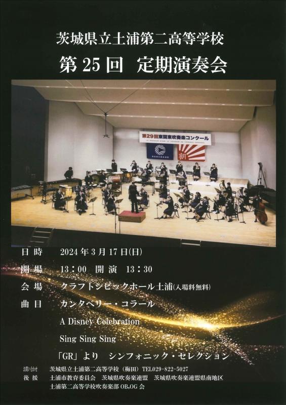 来たる3月17日(日),13:30より,土浦市のクラフトシビックホール土浦におきまして,吹奏楽部のコンサート「第25回定期演奏会」を開催いたします。「カンタベリー・コラール」「A Disney Celebration」など多くの曲でみなさまをおもてなしいたします。入場は無料となっています。暖かくなってきた春の午後のひととき,にこすいのコンサートに,ぜひみなさまお越しください!